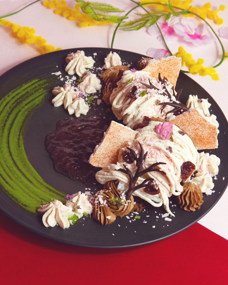 【KITTE大阪店 季節限定 3月26日(木)~】 ベリー系のフルーティーさスパイス感、スモーキーな味わいが特徴のトリニダード・トバゴ産カカオ豆と桜を合わせたデセールです。 桜のモンブランに2種類の餡や求肥、チェリーなど、桜と相性の良い食材を組み合わせました。 アクセントに抹茶ときな粉のソースを添え、和の素材とカカオの香りが調和する一皿に仕上げました。