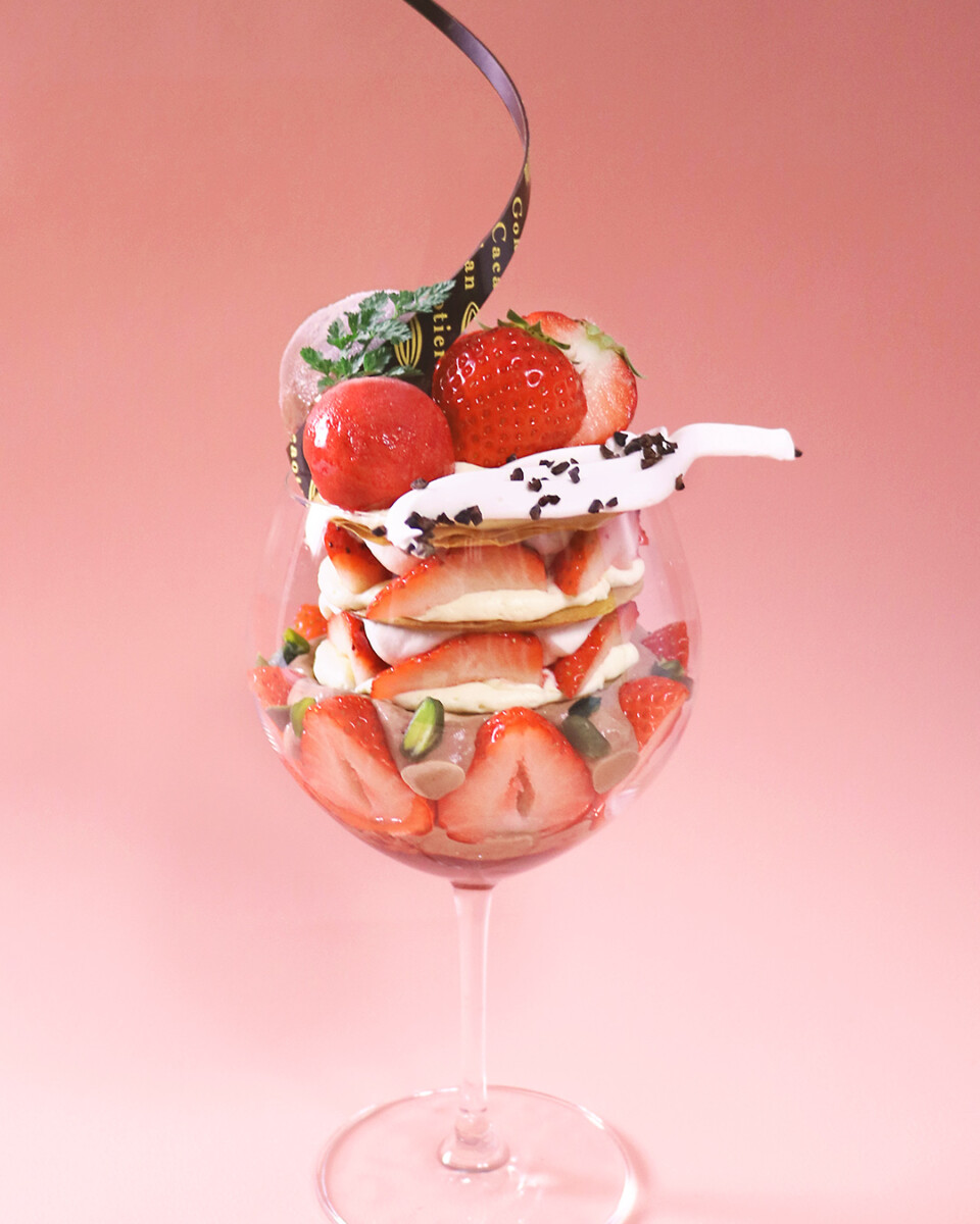 ショコラx苺を主役にした贅沢パフェ。濃厚なショコラベリーアイスと爽やかなフレーズソルベに、レアチーズムースとエルダーフラワーシャンティ、完熟苺を重ねたミルフィーユ。 白ワインジュレのさっぱりした後味と、苺コンフィチュールの甘酸っぱさが全体を引き締めます。 甘さ・酸味・香り・食感のバランスを楽しめる、『春』をイメージしたパフェです。
